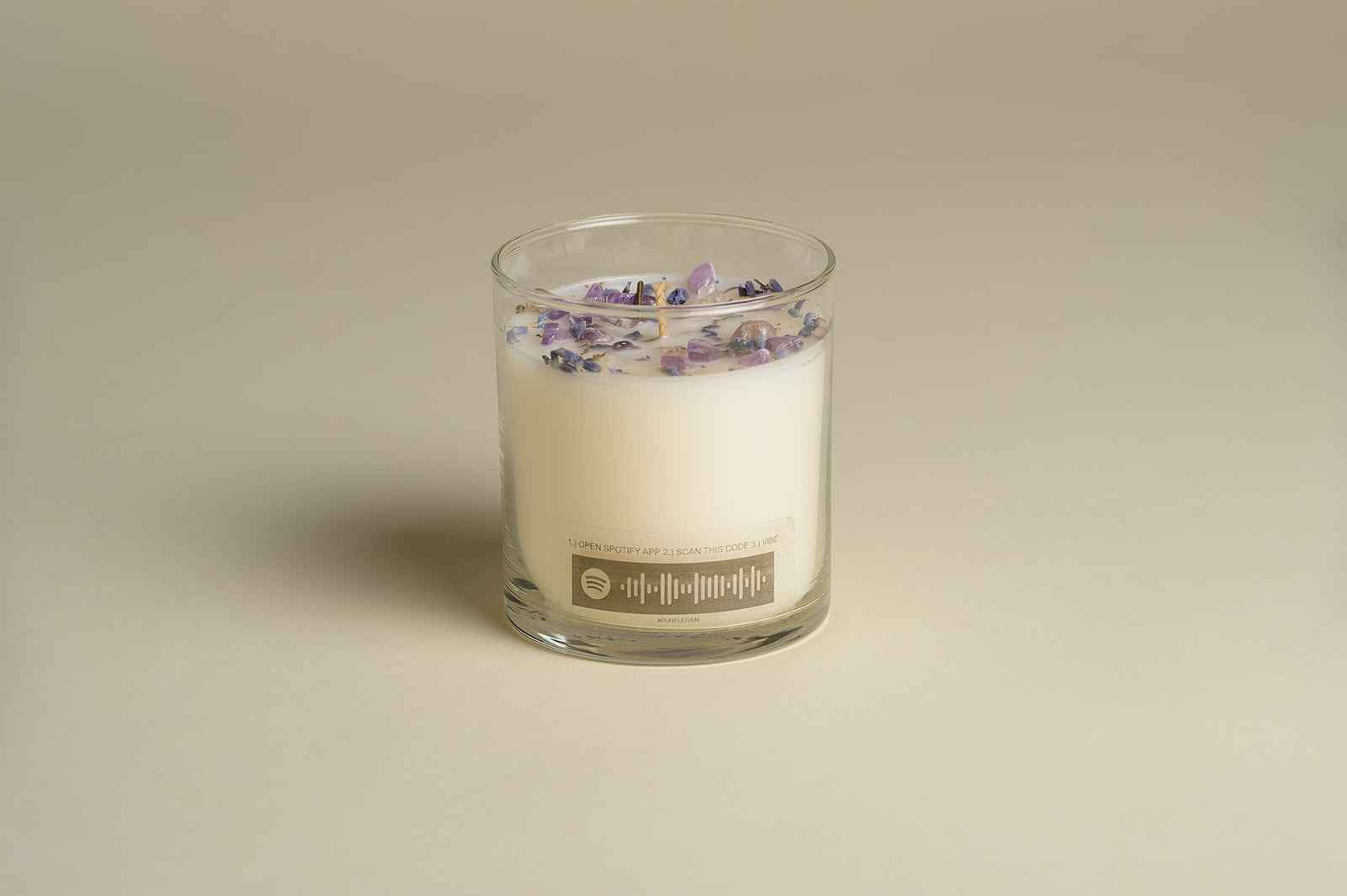 • Our large (9oz.)  #PurpleReign candle embellished with sweet dried lavender buds, and polished amethyst crystals