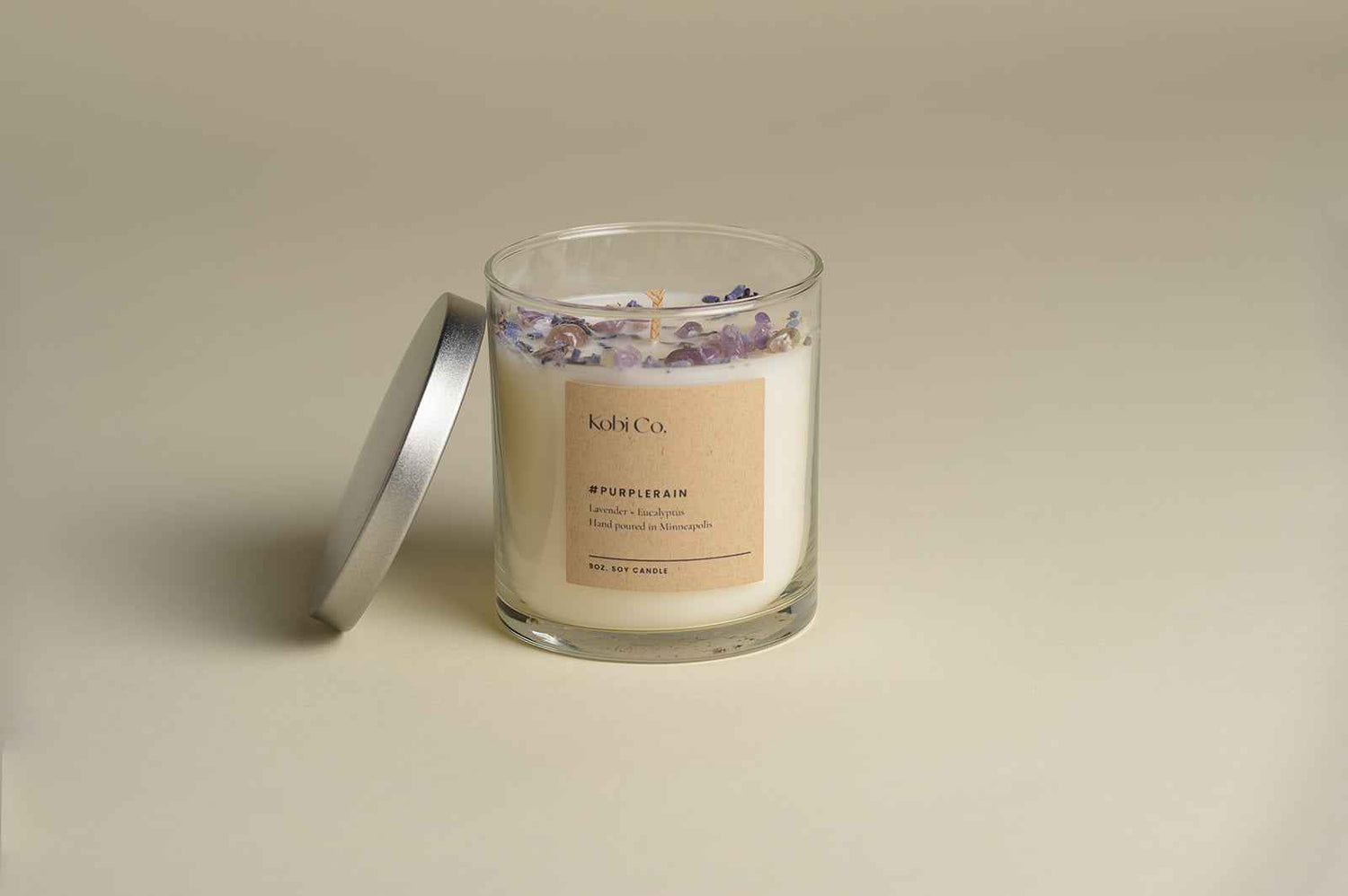 Our best-selling candle is embellished with dried lavender buds, rose hips, and amethyst crystals. Amethyst is known for its protection and purification properties—just like the waters of Lake Minnetonka. ;)