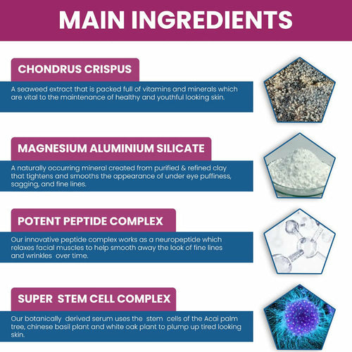 Our botanical-derived eye lift cream combines the power of 4 ingredients: Chondrus crispus for maintaining healthy and youthful skin, magnesium aluminum silicate for tightening, potent peptide complex for smoothing fine lines and wrinkles, and super stem cell complex for plumping up tired-looking skin.